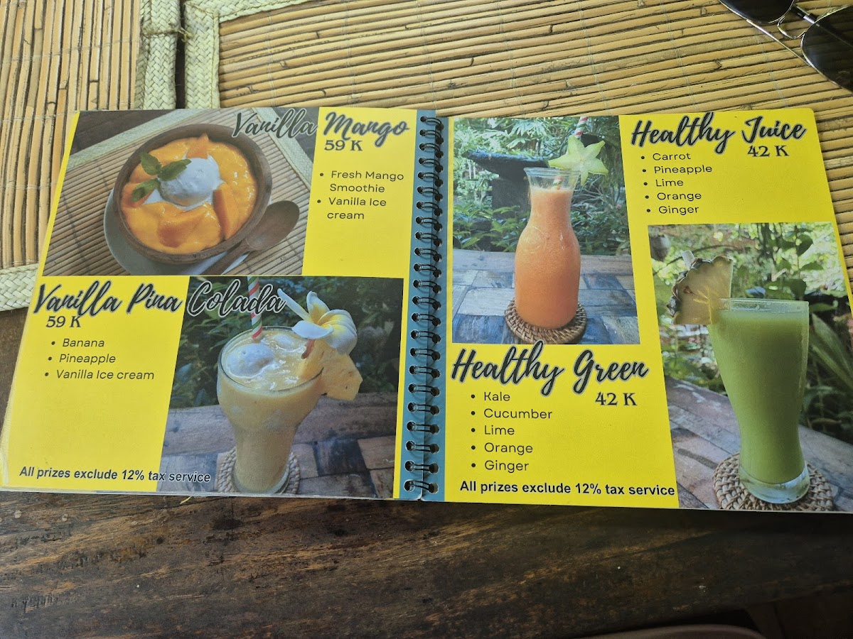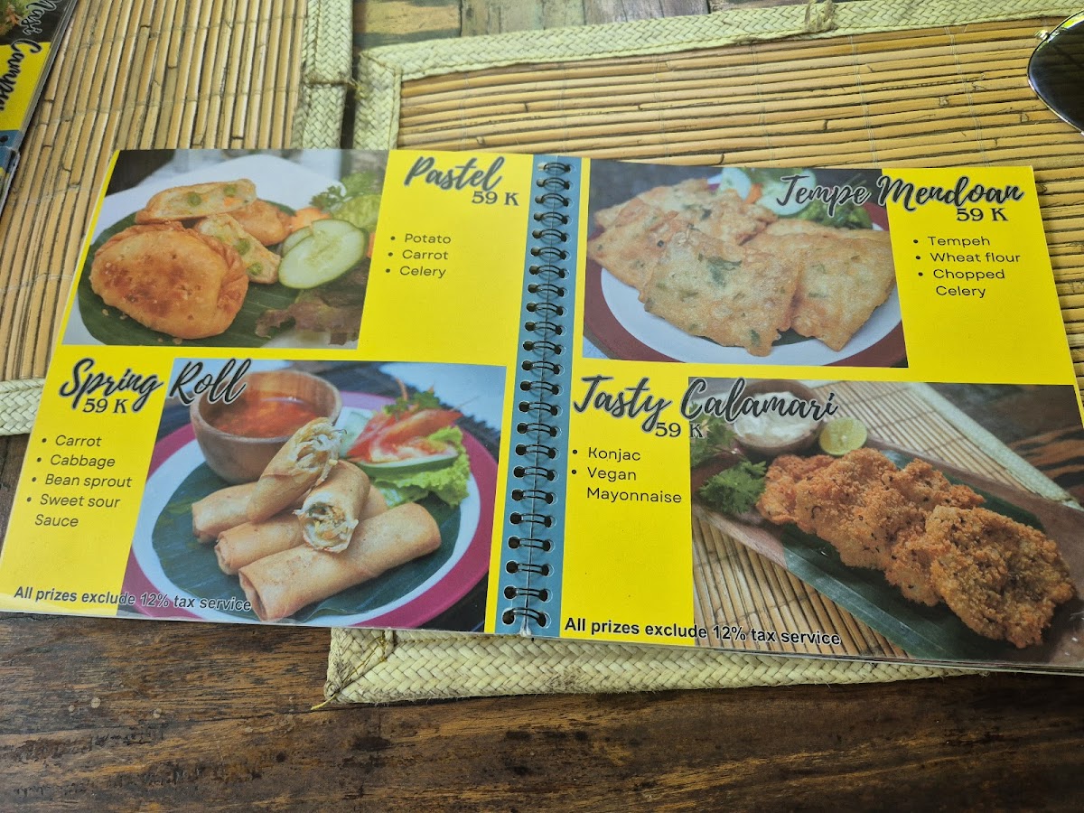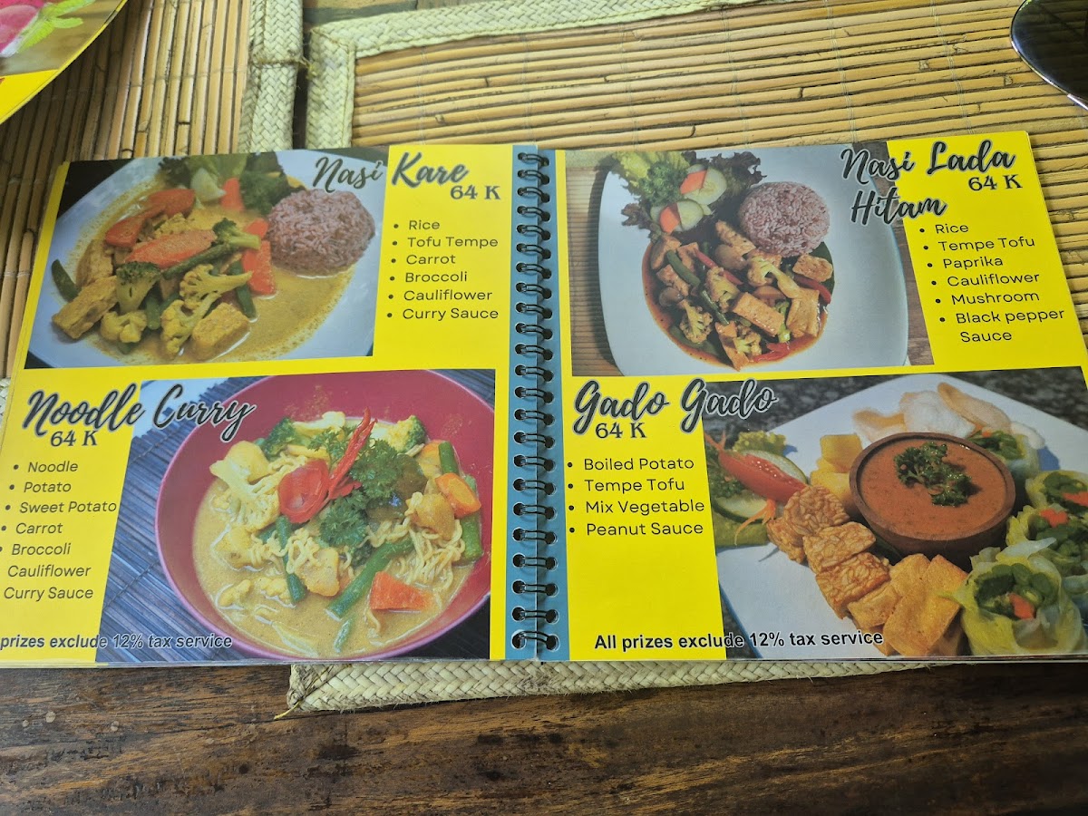 The menu features a diverse selection of vegan Indonesian dishes with a focus on traditional and plant-based recipes. Offerings include various appetizers, main courses, and desserts, accompanied by a range of healthy beverages such as fresh juices.
