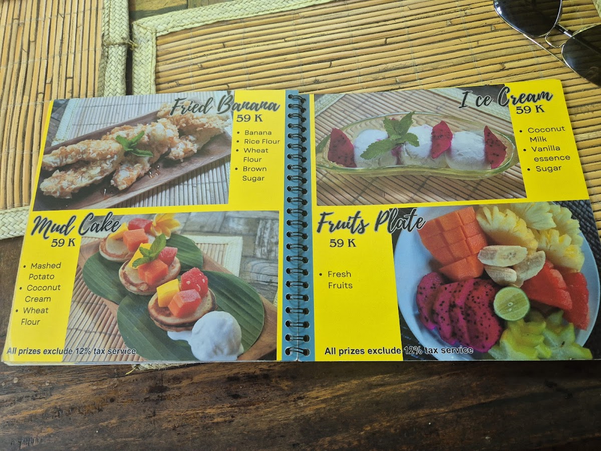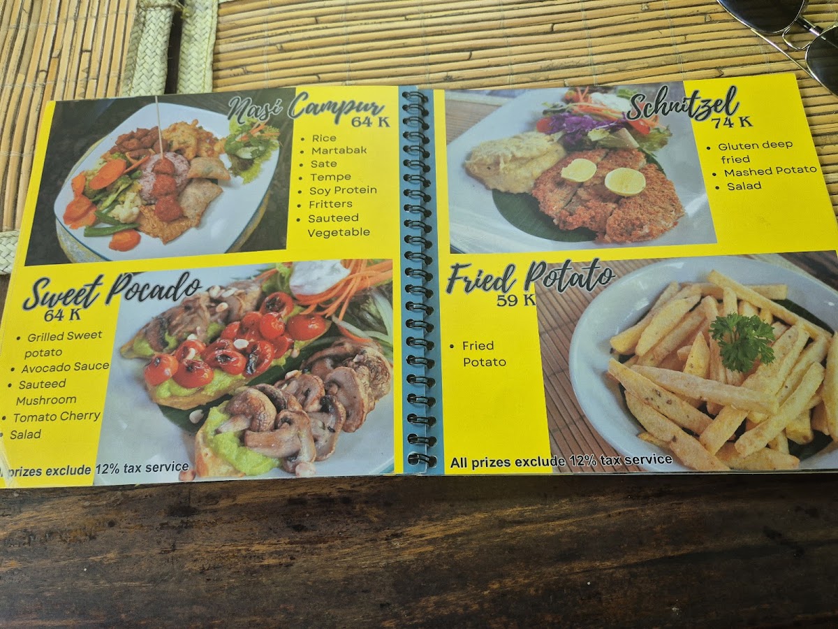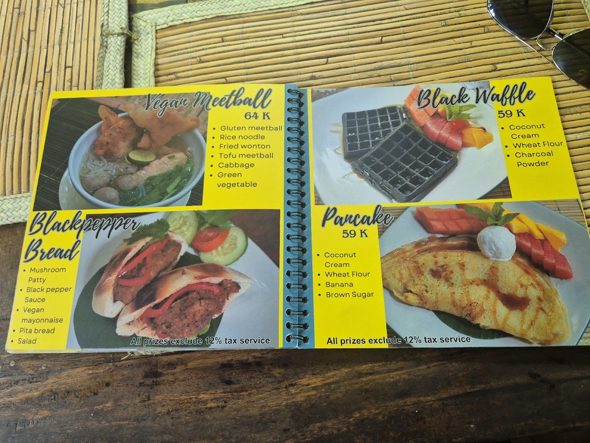 The menu features a diverse selection of vegan Indonesian dishes with a focus on traditional and plant-based recipes. Offerings include various appetizers, main courses, and desserts, accompanied by a range of healthy beverages such as fresh juices.